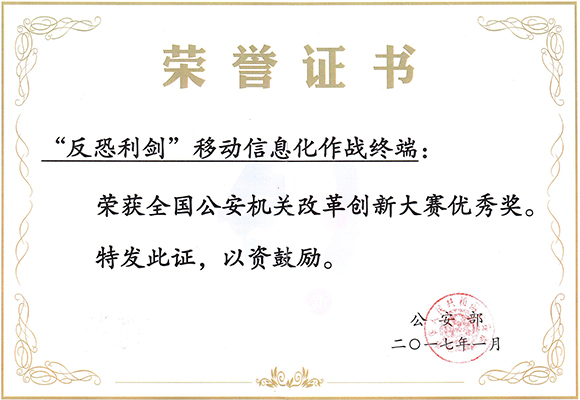 1月13日,全國公安機(jī)關(guān)改革創(chuàng)新大賽頒獎(jiǎng)儀式在北京隆重舉行,歷時(shí)9個(gè)月的改革創(chuàng)新大賽完美收官。大賽組委會(huì)從全國8000余個(gè)參賽作品中評(píng)選出金獎(jiǎng)20項(xiàng)、銀獎(jiǎng)30項(xiàng)、銅獎(jiǎng)50項(xiàng)、優(yōu)秀獎(jiǎng)100項(xiàng)以及優(yōu)秀組織獎(jiǎng)10家。其中,黑龍江省公安報(bào)送的“‘反恐利劍’移動(dòng)信息化作戰(zhàn)終端” 獲得了本次創(chuàng)新大賽的優(yōu)秀獎(jiǎng)。
