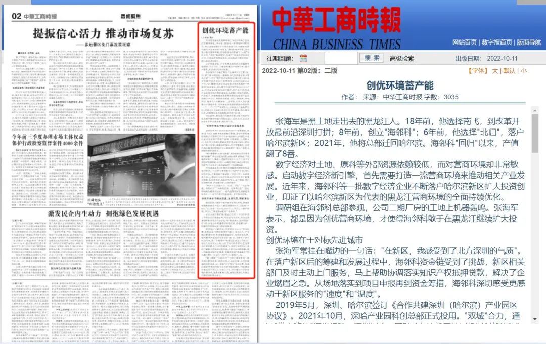 2022年10月11日,《中華工商時(shí)報(bào)》持續(xù)報(bào)道了《創(chuàng)優(yōu)環(huán)境蓄產(chǎn)能——從海鄰科騰飛看龍江數(shù)字經(jīng)濟(jì)新引擎正加速啟動(dòng)之二》,講述海鄰科“北歸”,擴(kuò)大投資創(chuàng)業(yè),助力打造龍江數(shù)字經(jīng)濟(jì)新引擎,印證了以哈爾濱新區(qū)為代表的黑龍江營(yíng)商環(huán)境的全面持續(xù)優(yōu)化。