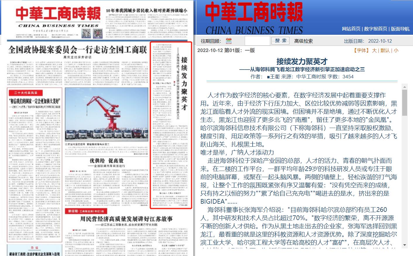 2022年10月12日,《中華工商時(shí)報(bào)》頭版連載《接續(xù)發(fā)力聚英才——從海鄰科騰飛看龍江數(shù)字經(jīng)濟(jì)新引擎正加速啟動(dòng)之三》,講述海鄰科作為北飛的"南雁",一直堅(jiān)持采取股權(quán)激勵(lì)、梯度引育、用足政策等一系列行之有效的舉措,吸引了越來(lái)越多的人才飛躍山海關(guān)、扎根黑土地。海鄰科已成為引領(lǐng)龍江數(shù)字經(jīng)濟(jì)產(chǎn)業(yè)強(qiáng)勁發(fā)展的領(lǐng)頭羊。