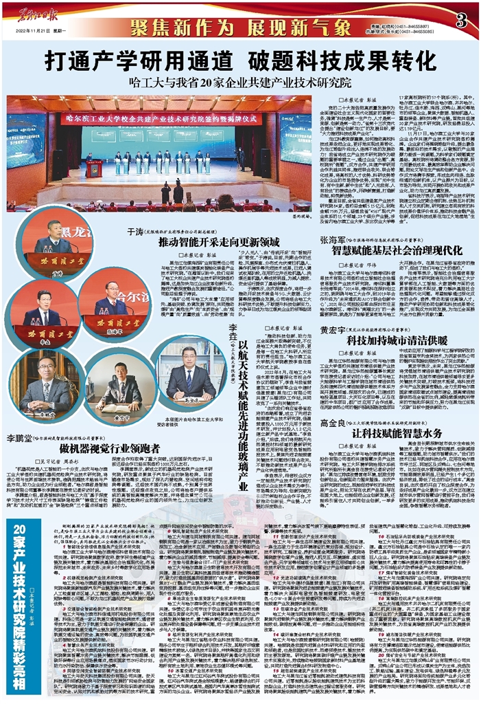 2022年11月21日,《黑龍江日報》以“打通產(chǎn)學(xué)研用通道 破題科技成果轉(zhuǎn)化”為題,整版報道了哈爾濱工業(yè)大學(xué)與20家企業(yè)合作共建產(chǎn)業(yè)技術(shù)研究院。合作雙方將攜手探索,形成血肉相連、血脈相通的創(chuàng)新機體,以產(chǎn)業(yè)振興為目標(biāo),以市場為導(dǎo)向,共同開展協(xié)同攻關(guān)和成果產(chǎn)業(yè)化,助力龍江高質(zhì)量發(fā)展。