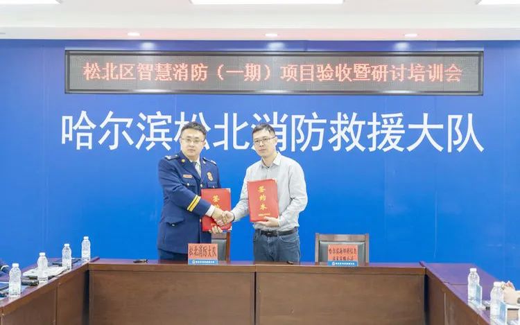 首先,由哈爾濱海鄰科信息技術(shù)有限公司消防副總經(jīng)理李哲名介紹智慧消防一期項(xiàng)目基本建設(shè)情況。在軟件平臺(tái)建設(shè)方面,目前已完成:智慧消控一張圖,物聯(lián)網(wǎng)平臺(tái)搭建,移動(dòng)監(jiān)督執(zhí)法平臺(tái)開發(fā)測(cè)試等工作。在硬件建設(shè)方面,已完成三維建模采集終端1臺(tái),火調(diào)一體箱3臺(tái),消防主機(jī)數(shù)據(jù)采集傳輸裝置50臺(tái),消防移動(dòng)執(zhí)法終端20臺(tái),便攜式打印機(jī)20臺(tái),5G移動(dòng)執(zhí)法記錄儀2臺(tái),消防警務(wù)通20臺(tái),服務(wù)器3臺(tái)的全部足量配備。目前,一期項(xiàng)目已完成示范型重點(diǎn)單位37家的數(shù)據(jù)接入管理,并對(duì)其中4家單位進(jìn)行了三維模型。隨后,松北區(qū)消防救援大隊(duì)孫興明大隊(duì)長(zhǎng)與哈爾濱海鄰科信息技術(shù)有限公司消防副總經(jīng)理李哲名共同簽訂“松北區(qū)社會(huì)治理創(chuàng)新全國(guó)示范項(xiàng)目消防云平臺(tái)運(yùn)行服務(wù)協(xié)議”。