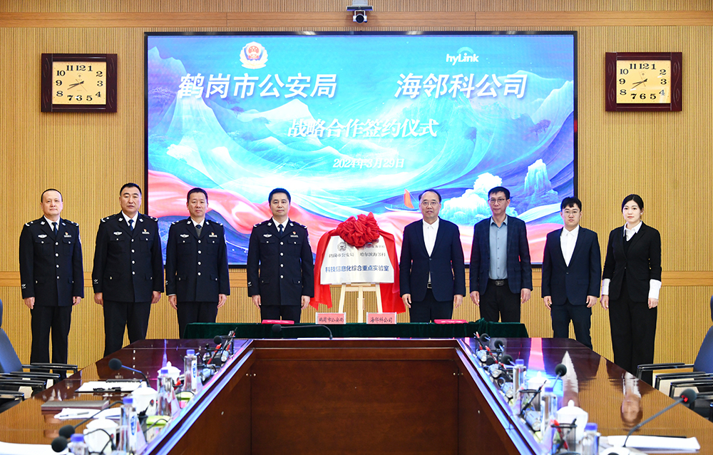2024年3月29日,鶴崗市公安局與哈爾濱海鄰科信息技術有限公司(簡稱“海鄰科”)舉行戰(zhàn)略合作簽約暨“科技信息化綜合重點實驗室”揭牌儀式。鶴崗市副市長、市公安局黨委書記、局長陳偉宏,海鄰科董事長兼總裁張海軍出席儀式,代表雙方簽約并致辭。