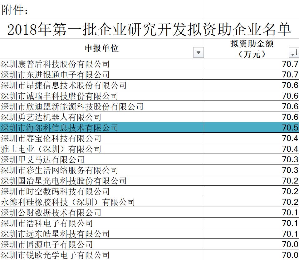 喜報!海鄰科獲深圳2018首批“企業(yè)研究開發(fā)資助計劃”專項資助!
