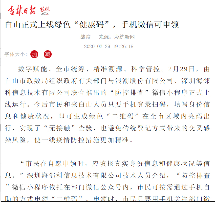 精準防疫!海鄰科綠色“健康碼”白山上線